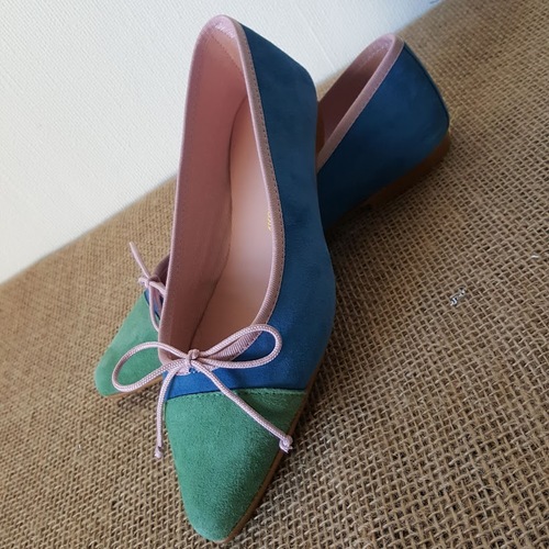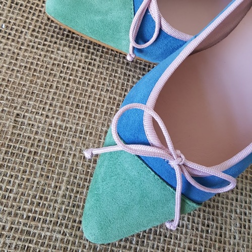 Bailarina combinada con puntera ante clorofila y ribete rosa. Plantilla interior de piel y forro de tela. El cordón fino permite ajustarla (deshaciendo el lazo y apretarlo a tu gusto). Tacón 1 cm